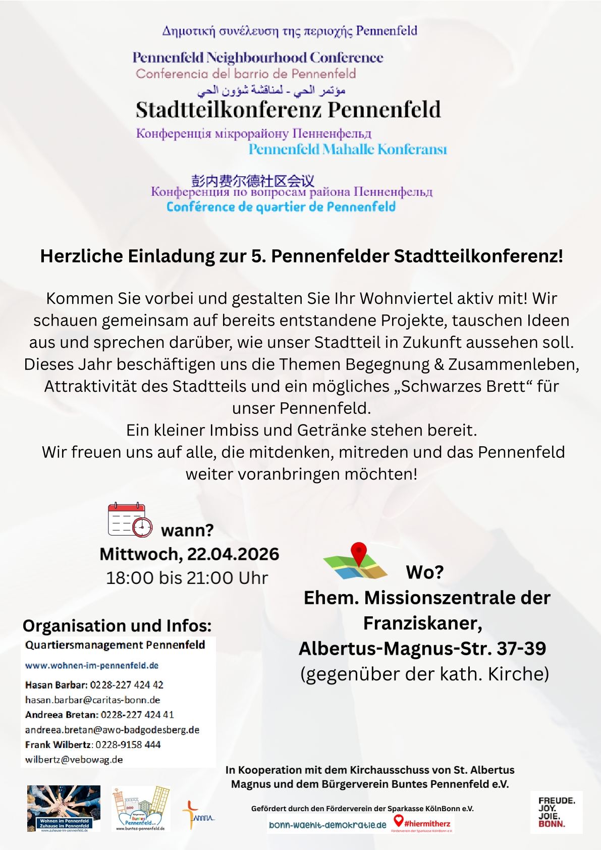 3. Schon einmal vormerken: am 22.4.2026 findet von 18 bis 21 Uhr die 5. Pennenfelder Stadtteilkonferenz statt