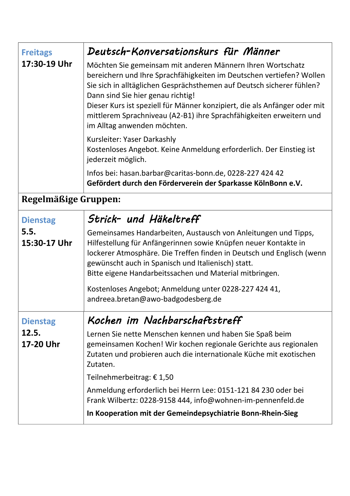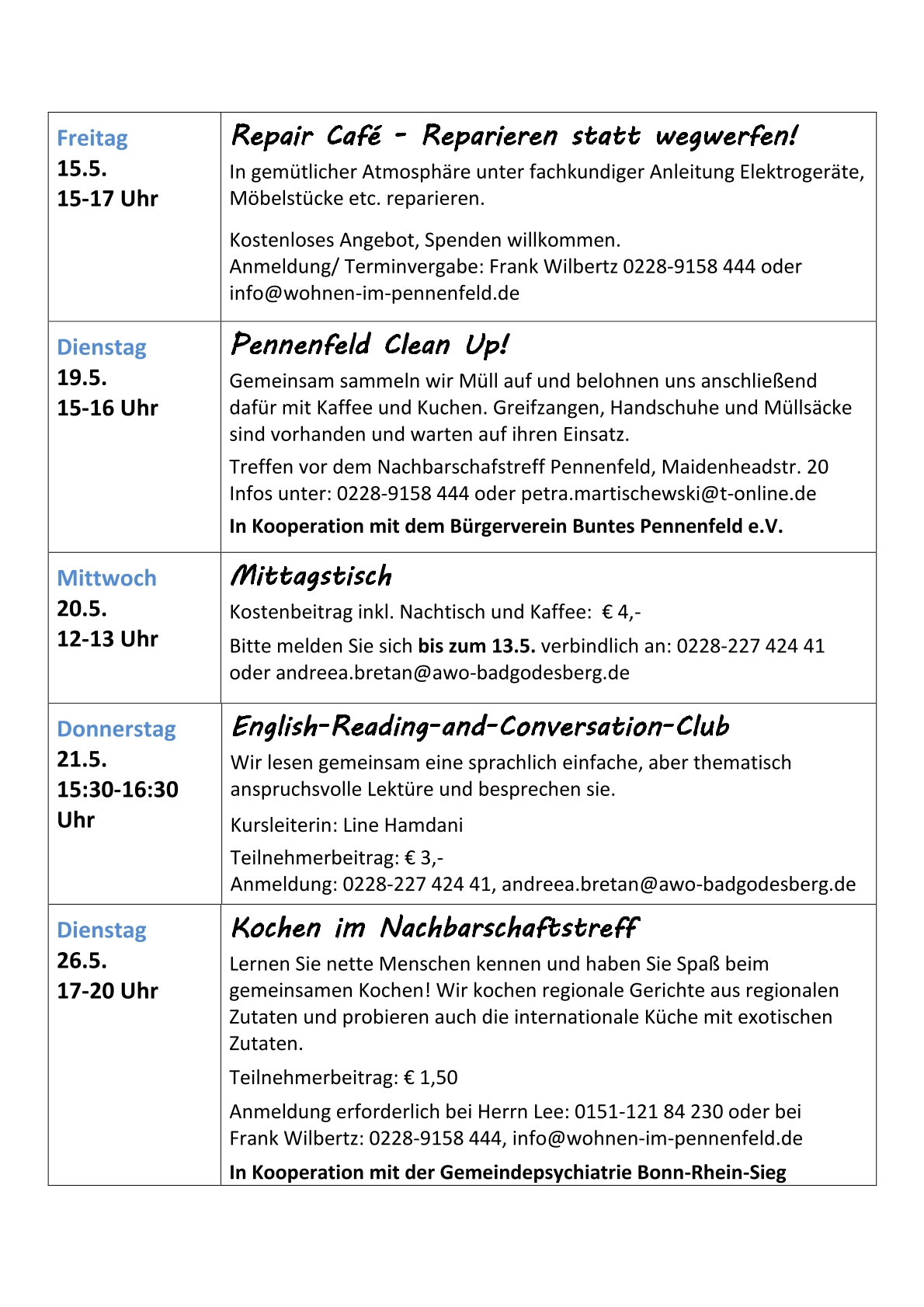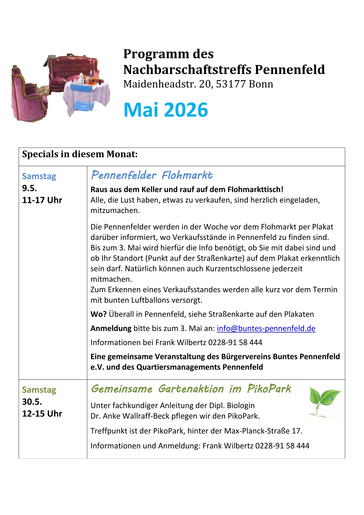 Das Mai-Programm des Nachbarschaftstreffs Pennenfeld wilbertz@vebowag.de2026-04-29T19:09:31+02:0029. April 2026|Allgemein| Ähnliche Beiträge
